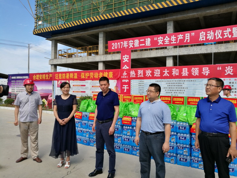 在生物島項(xiàng)目施工現(xiàn)場,縣委書記楊波,縣委副書記、縣長劉牧愚一行將防暑降溫物品一一送到建設(shè)者手中并與他們親切握手,感謝他們?yōu)樘涂h經(jīng)濟(jì)發(fā)展做出的積極貢獻(xiàn),并再三叮囑項(xiàng)目公司做好高溫天氣下的防暑降溫工作,注意勞逸結(jié)合,確保施工安全。楊波對(duì)項(xiàng)目的進(jìn)展情況進(jìn)行了詳細(xì)調(diào)研并就項(xiàng)目進(jìn)度等有關(guān)問題,與安建投資公司副總經(jīng)理朱友良,太和縣PPP項(xiàng)目公司總經(jīng)理高偉進(jìn)行交流和溝通。