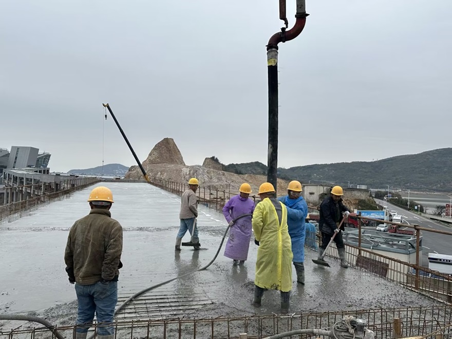 4月7日 ,在建工投資嵊泗項(xiàng)目公司和項(xiàng)目部統(tǒng)籌協(xié)調(diào)下,隨著最后一車混凝土澆筑完成,嵊泗旅游交通集散中心登船連廊上部房建主體框架結(jié)構(gòu)順利封頂,標(biāo)志著登船連廊整體正式進(jìn)入二次結(jié)構(gòu)和安裝工程施工。