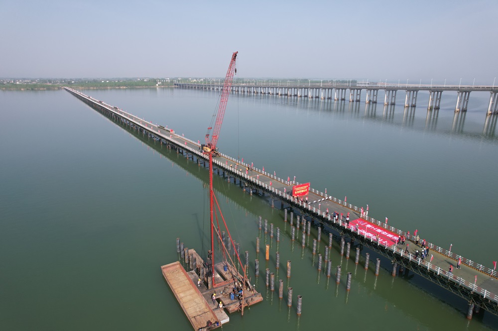 建工投資S20長(zhǎng)固高速城西湖特大橋鋼便橋全幅貫通